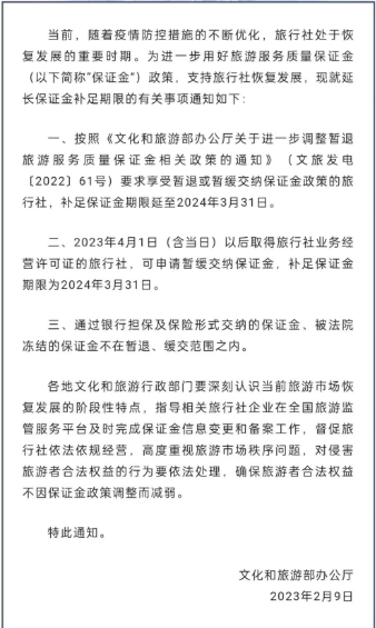 北京市文化和旅游局發(fā)布關(guān)于延長(zhǎng)旅游服務(wù)質(zhì)量保證金補(bǔ)足期限的通知,北京市已享受暫退或暫緩交納保證金政策的旅行社,補(bǔ)足保證金期限延至2024年3月31日。