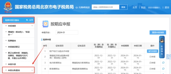 二、稅費(fèi)申報(bào)及繳納—申報(bào)臺(tái)賬查詢,查詢即可。